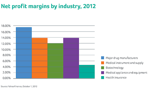 4.5 percent. By comparison, major drug manufacturers have an average profit margin of 16.7 percent; medical instrument and supply companies, 13.6 percent; biotechnology, 11.9 percent; and medical appliance and equipment companies, 13.7 percent.22