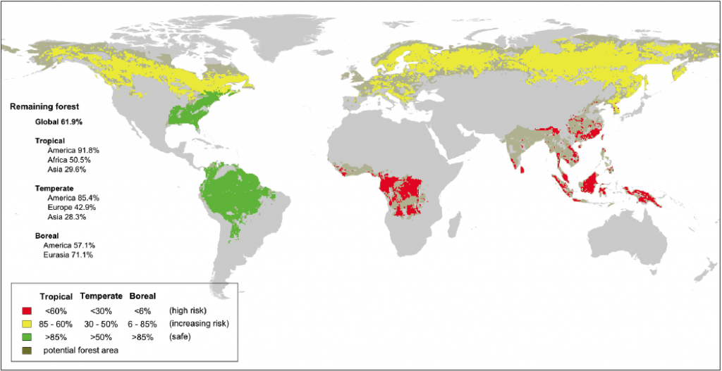 Now we have succeeded in transgressing a fourth limit: the amount of forestland being bulldozed or burned out of existence (see map below). Less and less forest reduces the planet’s ability to absorb some of that carbon dioxide and to produce water vapor, crucial to plant life. And the ongoing loss alters how much of the sun’s energy is absorbed or reflected across wide regions, which itself can modify climate.