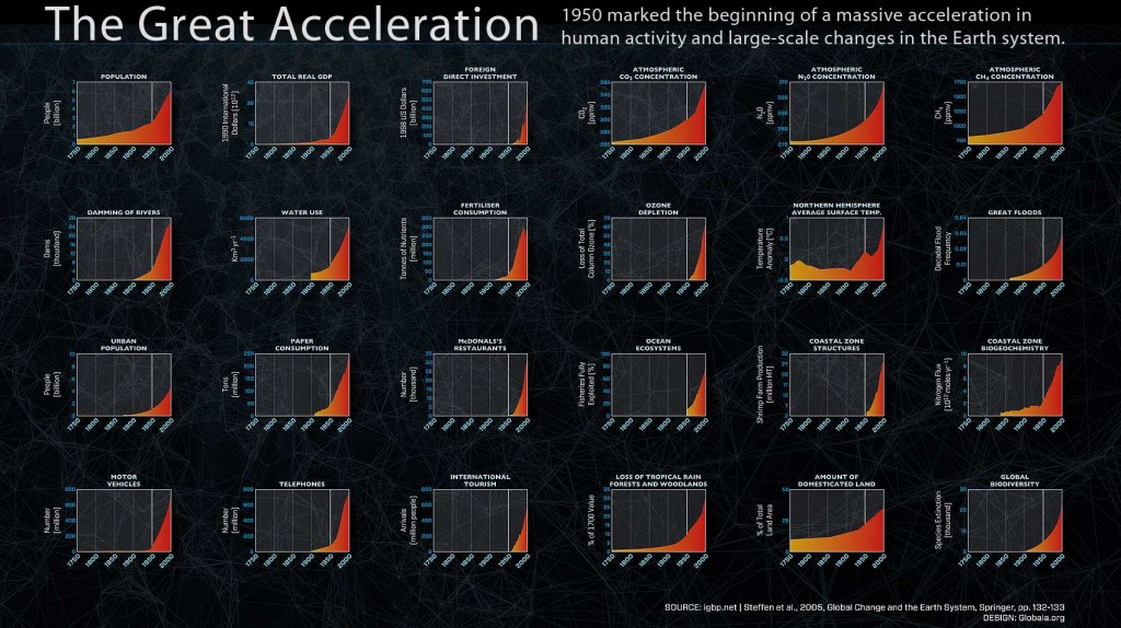 The realization that it is time to talk tough comes from a second new paper appearing today online in Anthropocene Review, also led by Steffen. It updates a striking set of 24 graphs (below) that show that almost all the damage to earth by humans has occurred since 1950, in lock step with rapid economic growth worldwide. This “great acceleration” of social, economic and environmental drivers basically says that although growing population adds stress to the earth’s systems, greater consumption through rising living standards is responsible for even more of the burden.